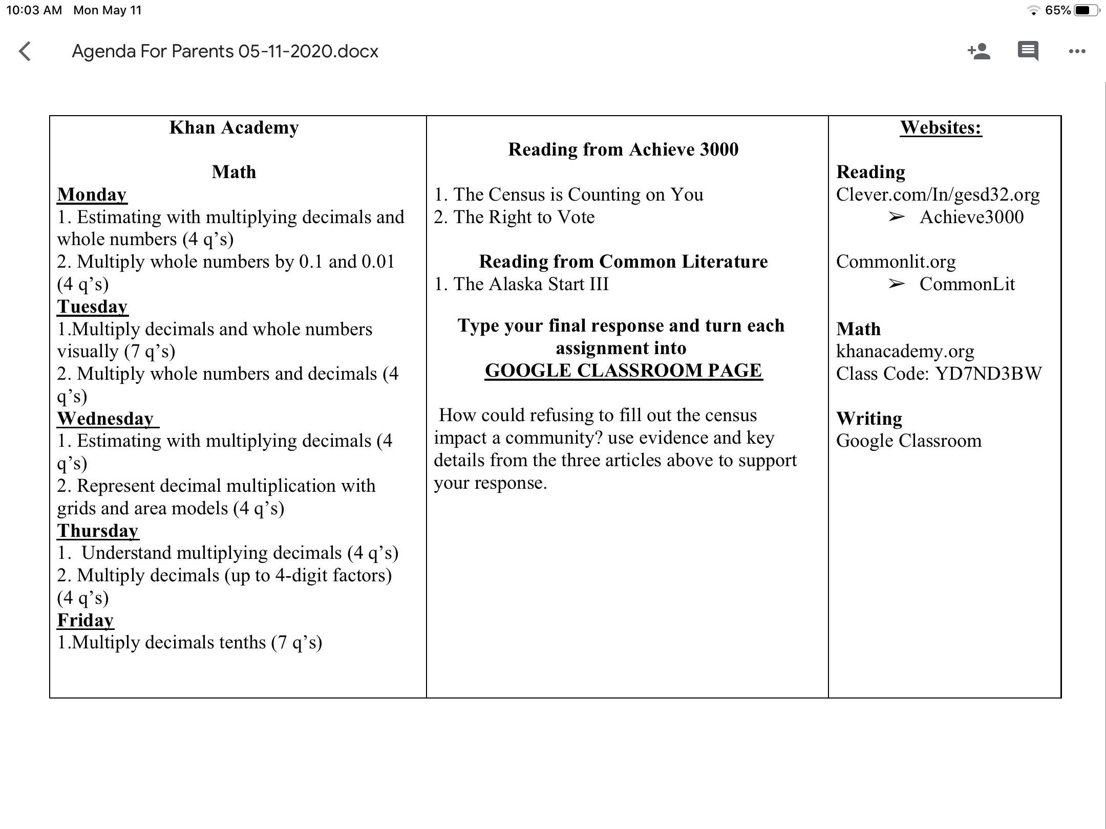 Below, I have attached the agenda for the assignments in reading, writing, and math.
